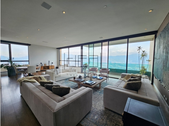Con 483 m2, este apartamento destaca por su excelente distribución y generosos espacios. Cuenta con dos salas, comedor, ventanales de piso a techo y balcones perimetrales que enmarcan una vista imponente hacia Medellín y Las Palmas. La altura de los techos brinda amplitud y luminosidad. Además, dispone de cocina independiente, baño social y sala de TV que puede convertirse en una cuarta alcoba.