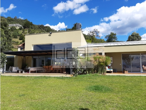 Lote de 3.500 m2 y 520 m2 construidos, 380 m2 en un solo nivel. Amplia zona social con sala con chimenea, comedor, cocina abierta con isla, zona de ropas, despensa, baño social y alcoba del servicio.Tiene 4 habitaciones: la principal con vestier, baño, ducha y bañera; dos auxiliares con baño, vestier y mezanine; y una habitación de huéspedes con ingreso independiente.